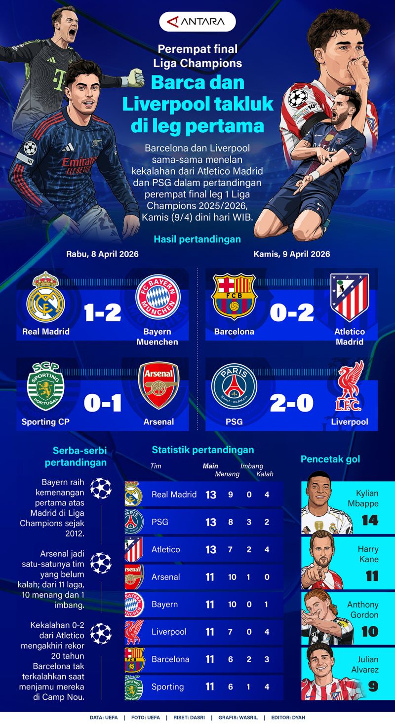 Barcelona dan Liverpool sama-sama menelan kekalahan dari Atletico Madrid dan PSG dalam pertandingan perempat final leg 1 Liga Champions 2025/2026, Kamis (9/4) dini hari WIB.