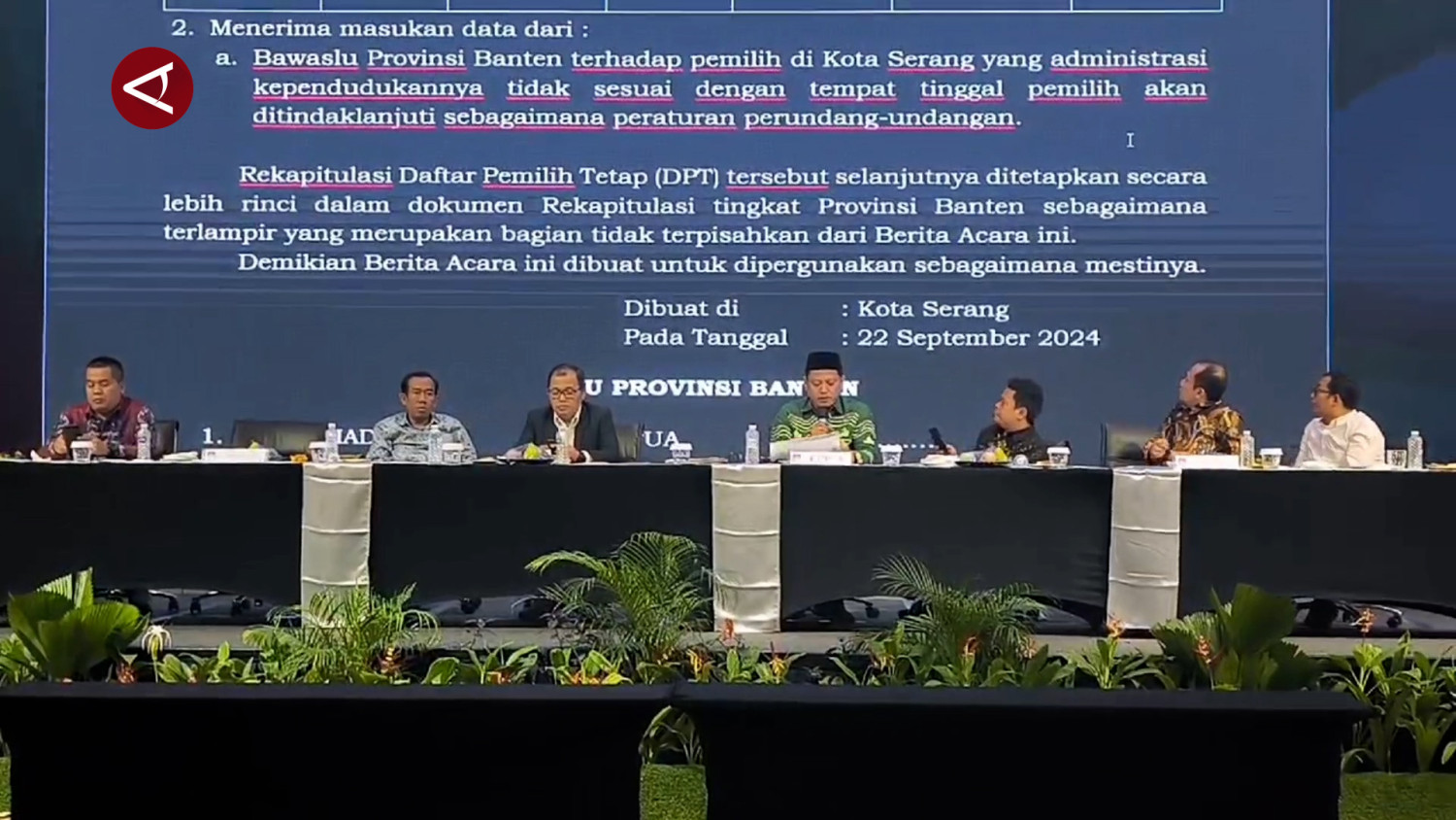 ANTARA - Komisi Pemilihan Umum (KPU) Provinsi Banten, menetapkan jumlah daftar pemilih tetap (DPT) dan pasangan calon Gubernur dan Wakil Gubernur Banten pada Pilkada serentak 2024. Jumlah DPT di Banten ditetapkan sebanyak 8.926.662 pemilih dengan jumlah dua paslon Cagub Cawagub, yakni pasangan Airin Rachmi Diany - Ade Sumardi dan pasangan Andra Soni - Ahmad Dimyati Natakusumah yang ditetapkan memenuhi syarat maju di Pilgub Banten 2024. (Susmiatun Hayati/Devi Nindy Sari Ramadhan, Susmiatun Hayati/Arif Prada/Feny Aprianti)