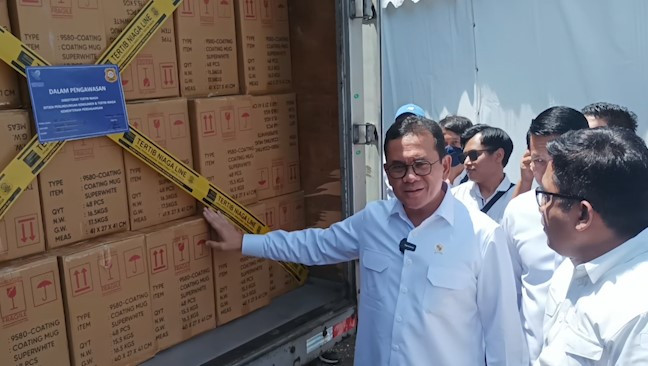 ANTARA - Menteri Perdagangan (Mendag) Budi Santoso memastikan barang-barang impor ilegal yang digagalkan aparat akan ditindaklanjuti proses hukumnya serta memberi sanksi kepada para pelaku. Sebagaimana disampaikan saat mengungkap keramik impor ilegal bernilai total Rp9,8 miliar yang dikirim melalui Pelabuhan Tanjung Perak Surabaya. (Hanif Nasrullah/Rizky Bagus Dhermawan/Gracia Simanjuntak)
