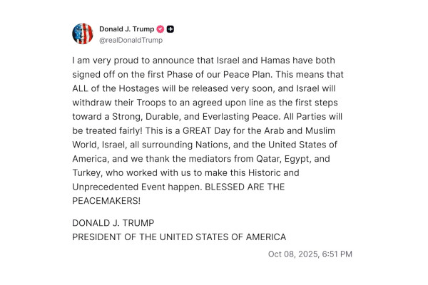 ANTARA - Presiden Amerika Serikat, Donald Trump, mengatakan pada Rabu (8/10), di media sosialnya bahwa Israel dan Hamas telah menyetujui tahap pertama dari rencana perdamaian Gaza. Kesepakatan ini menandakan bahwa seluruh sandera akan segera dibebaskan dan Israel akan menarik pasukannya sebagai langkah awal menuju perdamaian yang kuat dan tahan lama. (XINHUA/ Rijalul Vikry/Rizky Bagus Dhermawan/Ludmila Yusufin Diah Nastiti)